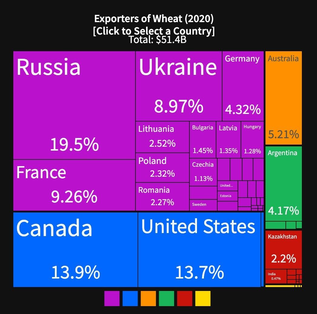 Let's begin with the first order effects: About 29% of worldwide wheat comes from Russia or Ukraine which have both banned exports of wheat due to the war. Accepting exports from Russia has also mostly been sanctioned by many countries.