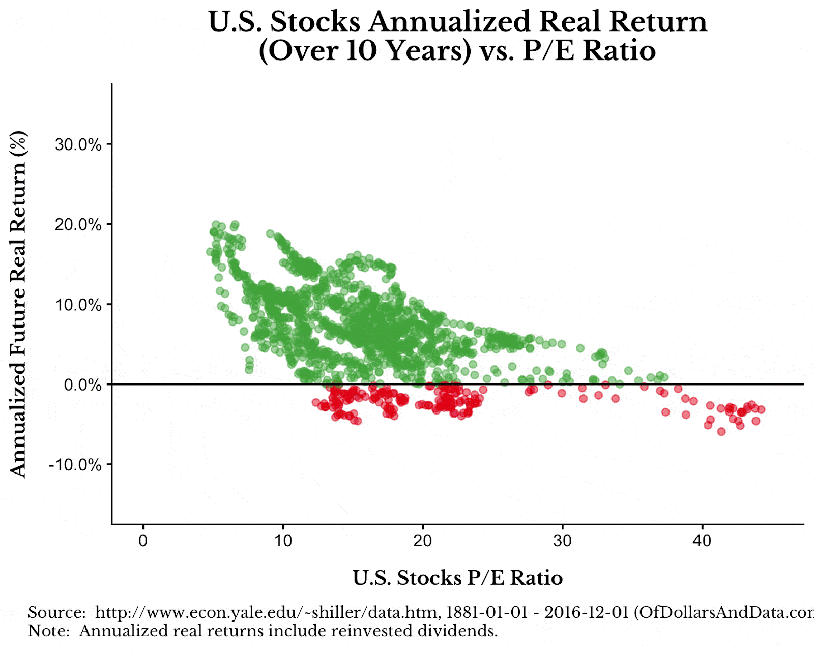 Dies ist ein Diagramm der jährlichen Renditen in der Zukunft in % (y-Achse) gegenüber einem erhöhten Kurs-Gewinn-Verhältnis von US-Aktien, das stark mit der Inflation korreliert: