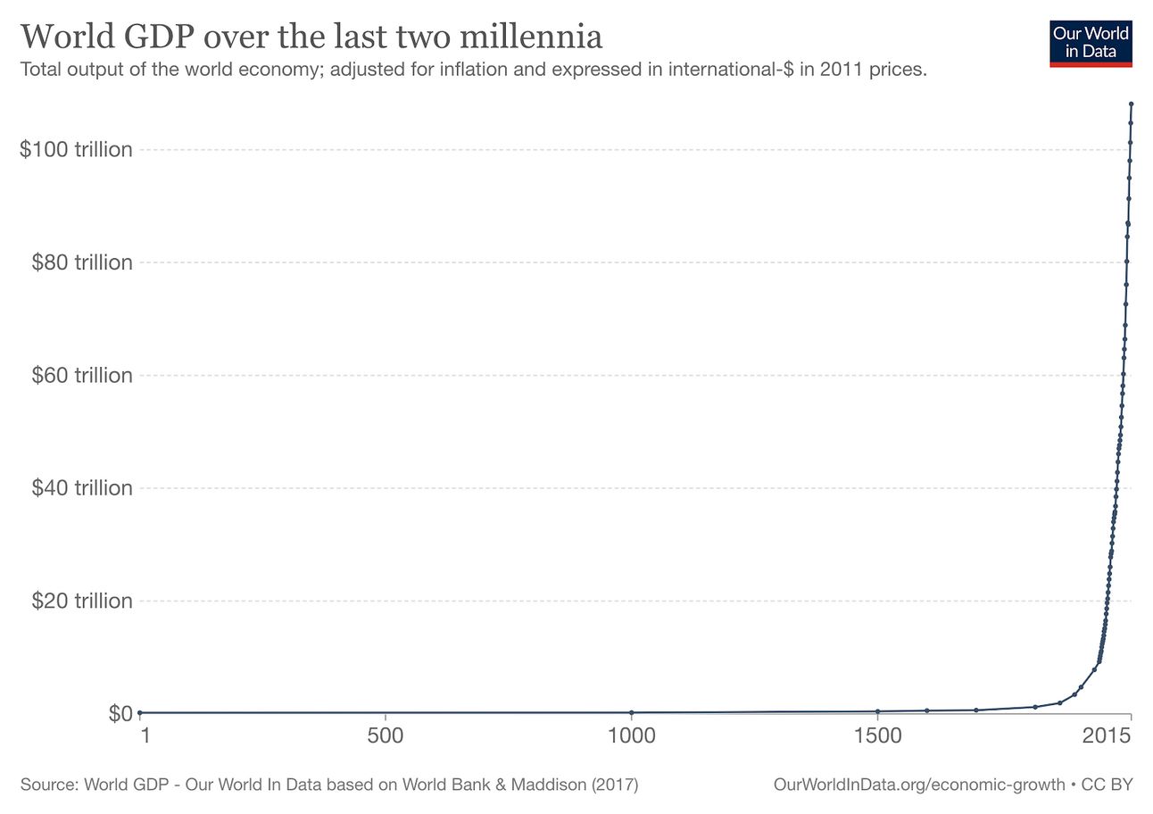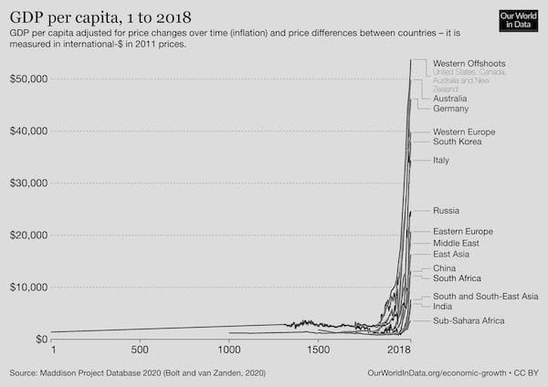 Of course, I agree with the perspective that it is still far from perfect as well as bringing significant negative externalities (e. g. environmental pollution) with it but what happened within the last 70 years is simply a miracle: If we compare the economic prosperity of every region today with any earlier time, we see that every single region is richer than ever before in its history. Economic growth, however, has not happened equally as fast in all regions. This has created substantial inequalities globally (see African/Asian regions in the chart below).