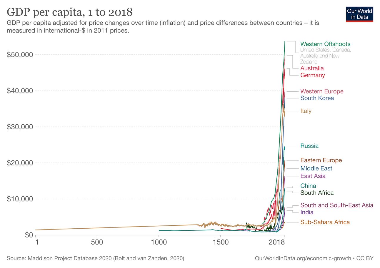 Natürlich stimme ich mit der Sichtweise überein, dass es noch lange nicht perfekt ist und erhebliche negative Externalitäten (z. B. Umweltverschmutzung) mit sich bringt, aber was in den letzten 70 Jahren geschehen ist, ist einfach ein Wunder: Wenn wir den wirtschaftlichen Wohlstand jeder Region heute mit einem früheren Zeitpunkt vergleichen, sehen wir, dass jede einzelne Region reicher ist als jemals zuvor in ihrer Geschichte. Das Wirtschaftswachstum hat sich jedoch nicht in allen Regionen gleich schnell entwickelt. Dies hat weltweit zu erheblichen Ungleichheiten geführt (siehe die Regionen Afrikas und Asiens in der nachstehenden Abbildung).
