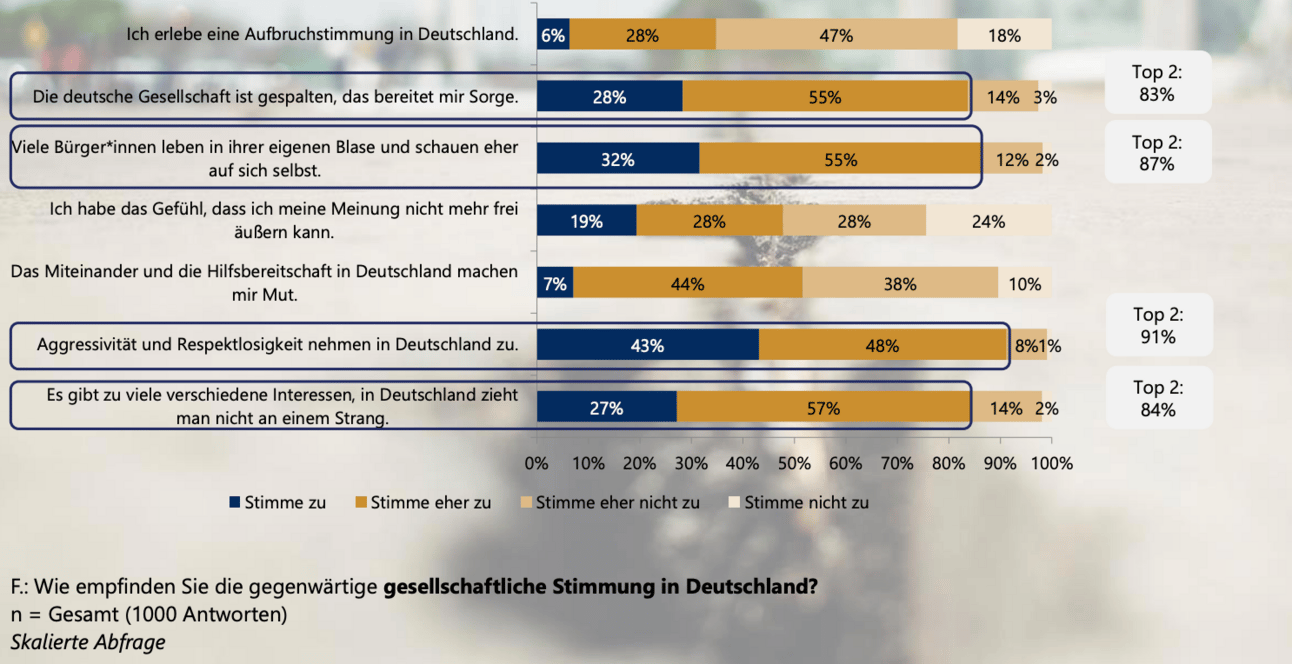 Das Vertrauen in den gesellschaftlichen Zusammenhalt schwindet zunehmend: 91 % nehmen eine wachsende Aggressivität in der Gesellschaft wahr.