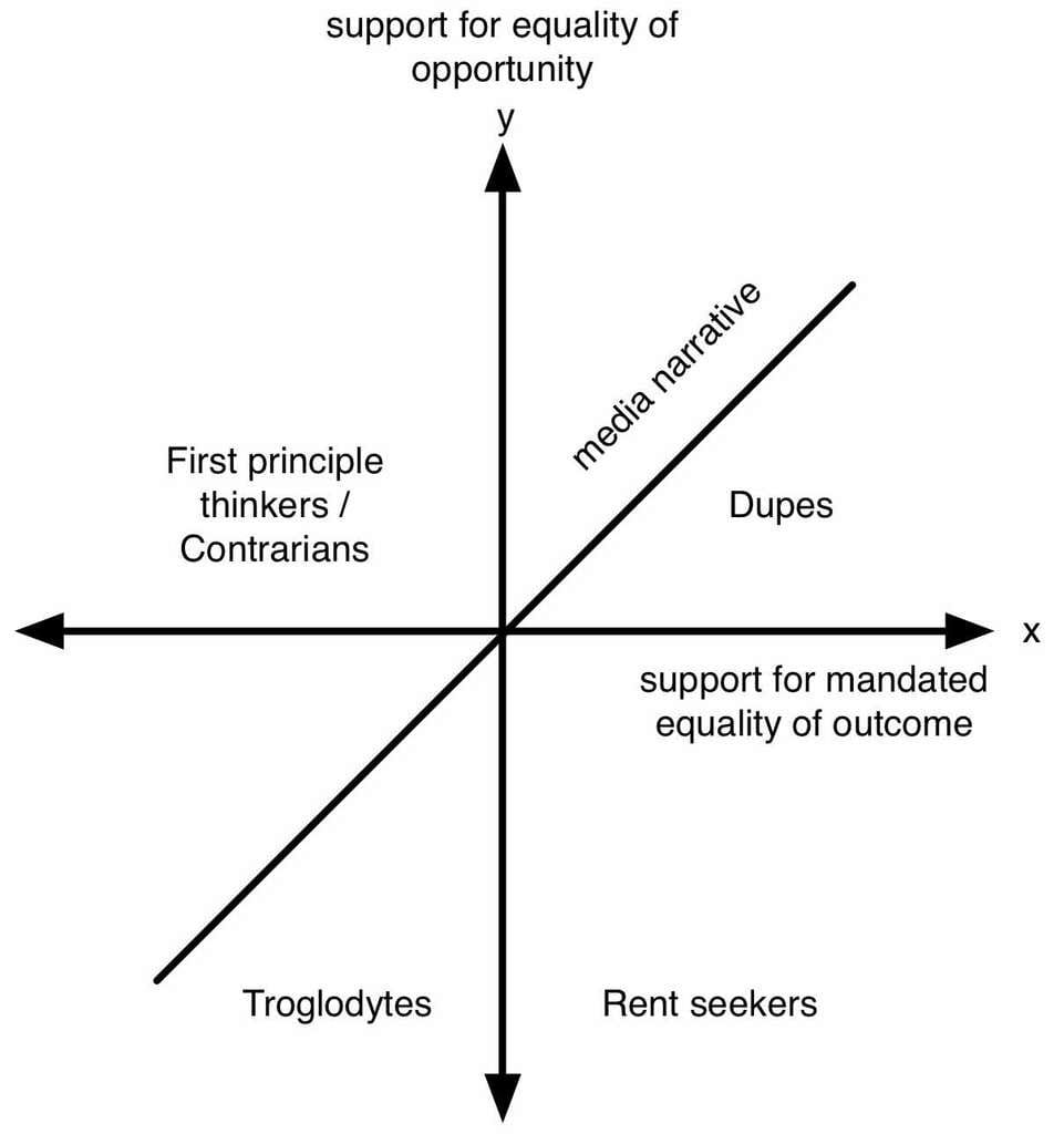 Thus, the First-Principle Thinker gets portrayed as a misogynist, moving him/her from the first-principle quadrant to the "Troglodytes" quadrant as the Dupe can only think along with the media narrative dimension. To use a classical metaphor: They only see black (troglodyte position) and white (dupe position) instead of all the layers of gray in between.